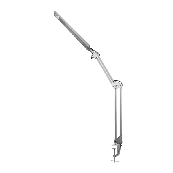 Настольный светодиодный светильник Camelion KD-821 C03 серебро, мощность 8Вт, световой поток 350лм. Универсальный светильник, служит для освещения рабочего места дома , в офисе и на производстве. Пластиковый плафон прямоугольной формы (30х5 см) имеет отверстие - ручку. Выключатель – на верхней части плафона. Стойка и струбцина – из металла. Два уровня яркости от 150 лм до 350 лм. Стойка – эргономичная, двухзвенная. (длина звеньев разная: нижнее – 30 см, верхнее – 20 см). Максимальная высота основания плафона над уровнем стола в рабочем положении ~50 см;