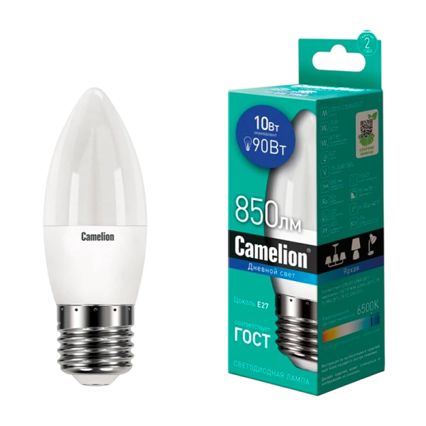 Светодиодная лампочка 10Вт E27 CAMELION LED10-C35/865/E27 используется в люстрах, бра, светильниках и других бытовых осветительных приборах. Форма колбы - свеча, соответствует маркировке С35. Колба матированная, ровно рассеивает свет от диодов, исключает появление “рисунков” на ровных однотонных стенах. Светодиодная LED лампа заметно сокращает счет за электроэнергию, потребляет всего 10Вт, выдает 850 люменов, аналогична лампочке накаливания, потребляющей 90Вт. Цветовая температура 6500 Кельвинов, что соответствует холодному белому цвету с голубым оттенком. Лампа CAMELION E27 работает в широком диапазоне от 170 до 265 Вольт, не чувствительна к перепаду напряжения в электросети. Светодиодная лампа СВЕЧА Е27 имеет привлекательный дизайн, тонкая, гармонично смотрится в осветительных приборах, не имеющих плафона или абажура.
