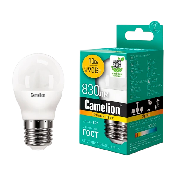 Светодиодная лампа Camelion LED10-G45/830/E27 мощностью 10 Вт идеально подойдет для жилых, офисных и коммерческих помещений. Обеспечивает высокое качество освещения и экономию электроэнергии. СДЛ Camelion - это инновационное решение, разработанное на основе новейших светодиодных технологий (LED). Предназначена для освещения жилых, офисных и коммерческих помещений. Встроенный источник питания позволяет использовать СДЛ Camelion в стандартных патронах.
