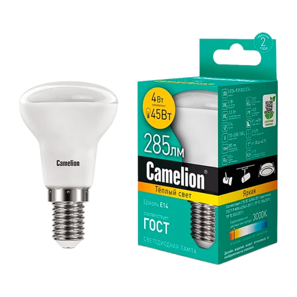 CДЛ Camelion LED4-R39/830/E14 - инновационная светодиодная лампа мощностью 4Вт и цветовой температурой 3000K. Отлично подходит для освещения жилых, офисных и коммерческих помещений.