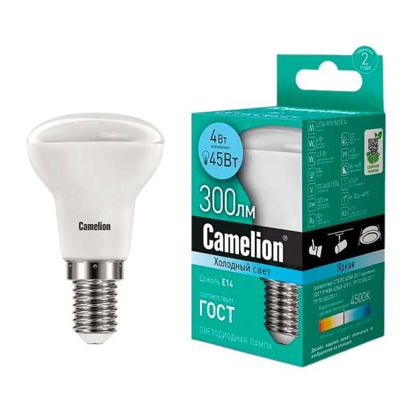 Светодиодная лампа Camelion LED4-R39/845/E14 мощностью 4Вт идеально подходит для освещения жилых и коммерческих помещений. CДЛ Camelion - это инновационное решение, разработанное на основе новейших светодиодных технологий (LED). Встроенный источник питания позволяет использовать Camelion в стандартных патронах.