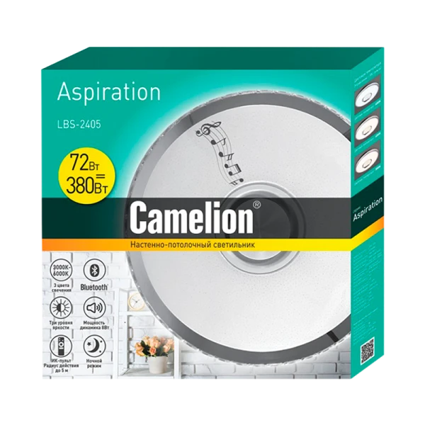 Настенно-потолочный светодиодный светильник Camelion LBS-2405 управляется через Bluetooth и с пультом. Идеален для бытовых и коммерческих помещений благодаря своей мощности 72Вт и регулируемой цветовой температуре 3000-6000К.