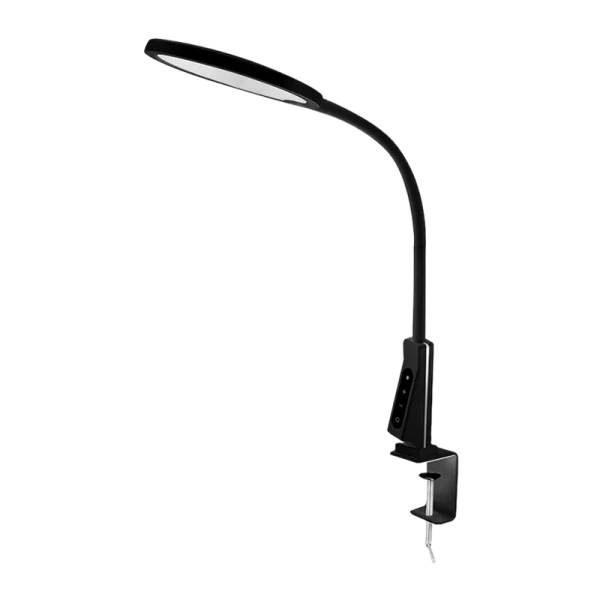 Светодиодный настольный светильник на струбцине Camelion KD-837 может использоваться в качестве источника местного освещения как в домашних помещениях, так в офисных и учебных учреждениях. Мощность 7Вт, яркость 450 лм, с высоким индексом цветопередачи (Ra > 85). Светильник имеет пять уровней регулировки яркости и пять режимов цветовой температуры (от 3000К до 6000К). Сенсорная панель управления световыми режимами находится на нижней части стойки.Светильник имеет USB-разъём 5В, 1А. Гибкая металлическая стойка имеет силиконовое покрытие. Мощная металлическая струбцина надежно фиксирует светильник на любой поверхности толщиной до 6,5 см. Пластиковый плафон имеет форму диска диаметром 16 см. Максимальная высота плафона над уровнем стола в рабочем положении ~ 42 см. Длина провода питания – 150 см.