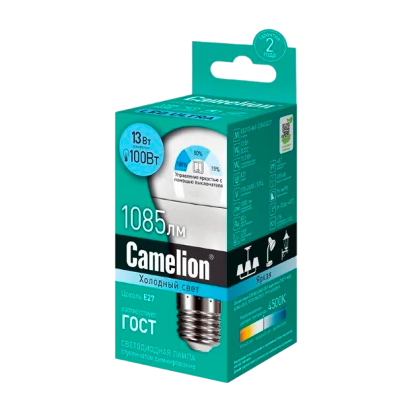 Светодиодная лампа Camelion LED13-A60/SDB/E27 мощностью 13Вт со ступенчатым изменением яркости. Цветовая температура 4500K, световой поток 1085 лм, цоколь E27. СДЛ Camelion - это инновационное решение, разработанное на основе жилых, новейших светодиодных технологий (LED). Предназначена для освещения офисных и коммерческих помещений. Встроенный источник питания позволяет использовать СДЛ Camelion в стандартных патронах.