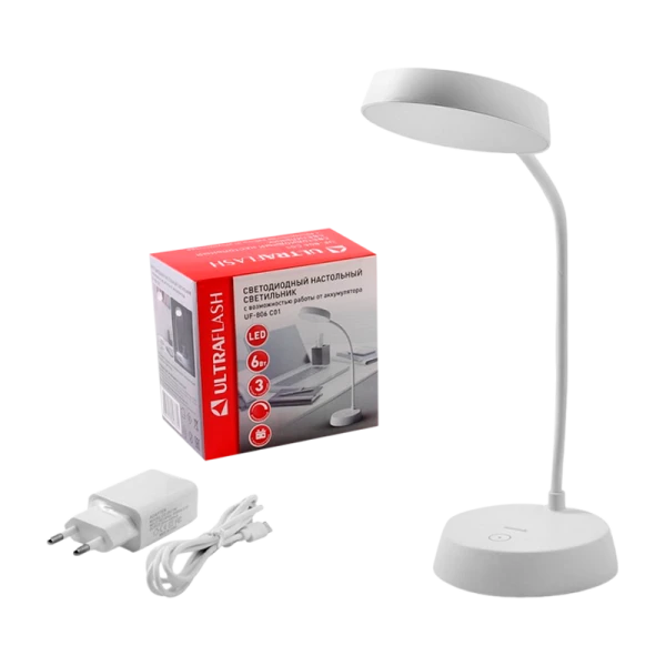 Настольный светильник Ultraflash UF-806 C01 идеально подходит для домашнего или офисного использования. Он оснащён аккумулятором и регулировкой цветовой температуры для комфортного освещения.