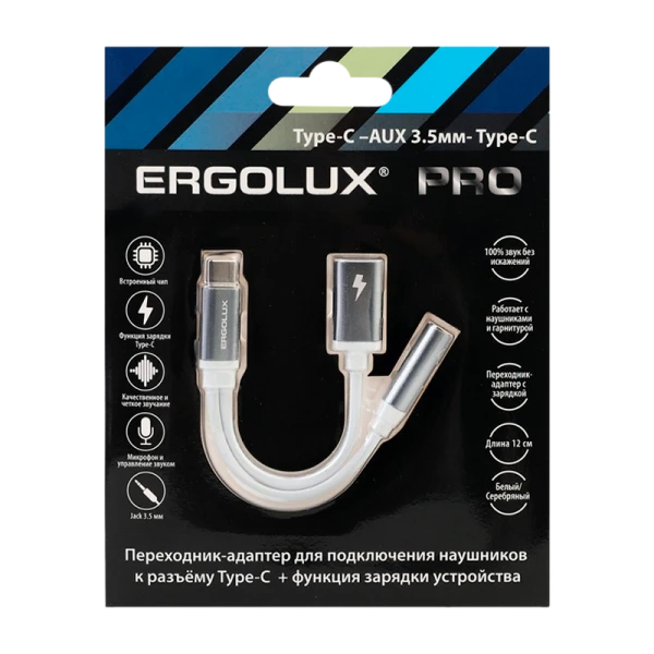 Звуковой адаптер ERGOLUX ELX-CSA02-C01 — переходник для подключения наушников с разъемом 3,5 мм к устройствам с разъемом Type-C. Позволяет одновременно слушать музыку и заряжать устройство. Обеспечивает стабильную передачу данных и высокую эффективность зарядки. Изготовлен из прочных и износостойких материалов. Длина 20см, белый цвет, упаковка – блистер.