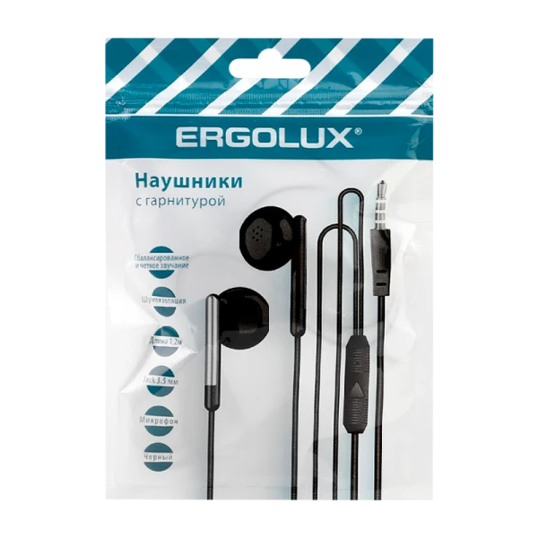 Наушники вставные Ergolux ELX-WHP01P-C02 с микр. черный пакет с подвесом (1/10/500)