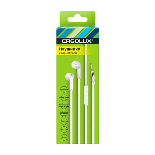 ERGOLUX ELX-WHP02-C01 - белые проводные наушники-вкладыши с микрофоном и трехкнопочным пультом управления. Диапазон частот 20-20 000 Гц и 3.5мм разъемом для компьютеров и смартфонов.