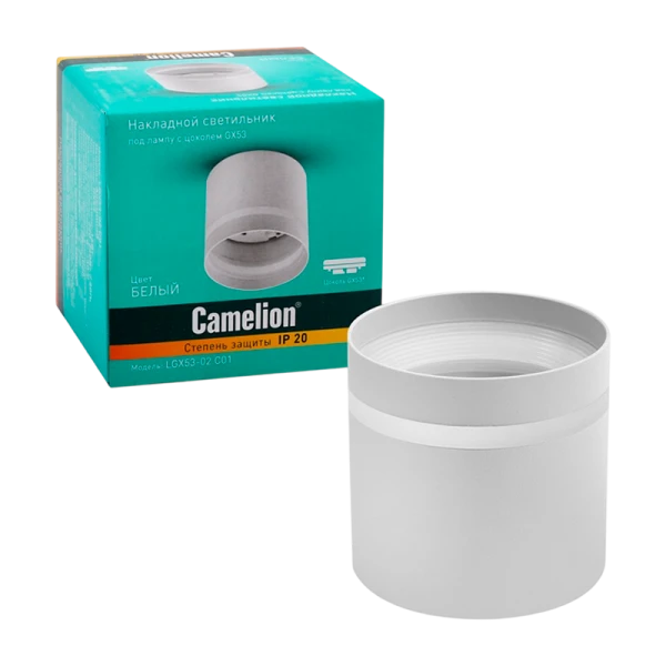 Camelion LGX53-02 C01 (накладной светильник, белый, IP20) - идеальный выбор для дома и офиса. Металлический корпус, степенью защиты IP20, рассчитан на одну лампу GX53.