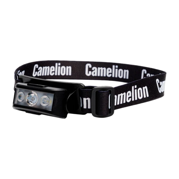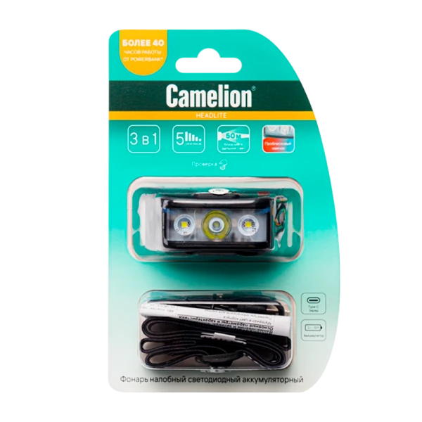 Фонарь налобный Camelion LED53403 светодиодный аккумуляторный с дополнительной возможностью длительной работы от внешнего аккумулятора большой емкости. Дальний, ближний свет, проблесковый маячок сине-красного света.