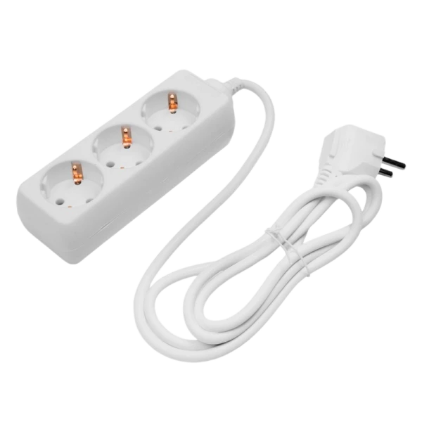 Бытовой удлинитель Volsten S 3x1,5-Z с заземлением и длиной кабеля 1,5 м. Подключает до трех электроприборов одновременно, максимальная мощность 3500Вт. Цвет удлинителя - белый.