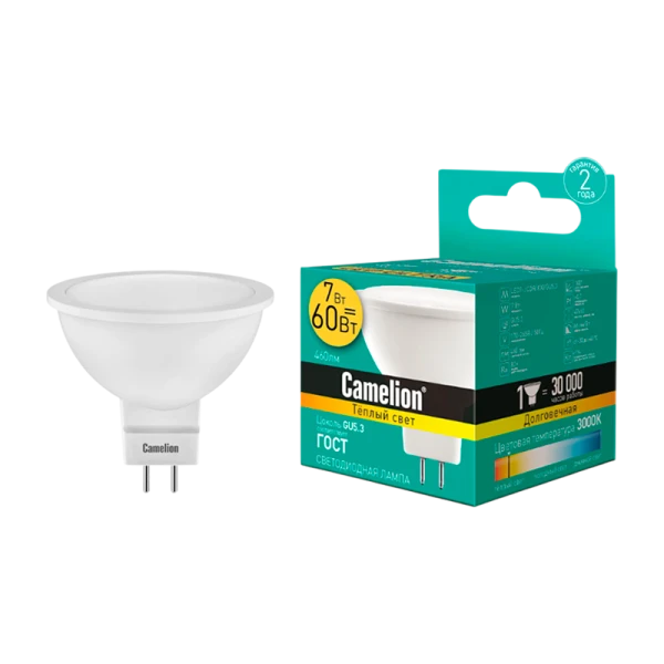 Лампа Camelion GU-5.3 светодиодная. устанавливается во встраиваемые светильники подвесных или натяжных потолков для постоянного освещения жилых и офисных помещений. В качестве точечной подсветки используется в корпусной мебели или каркасных перегородках интерьера.