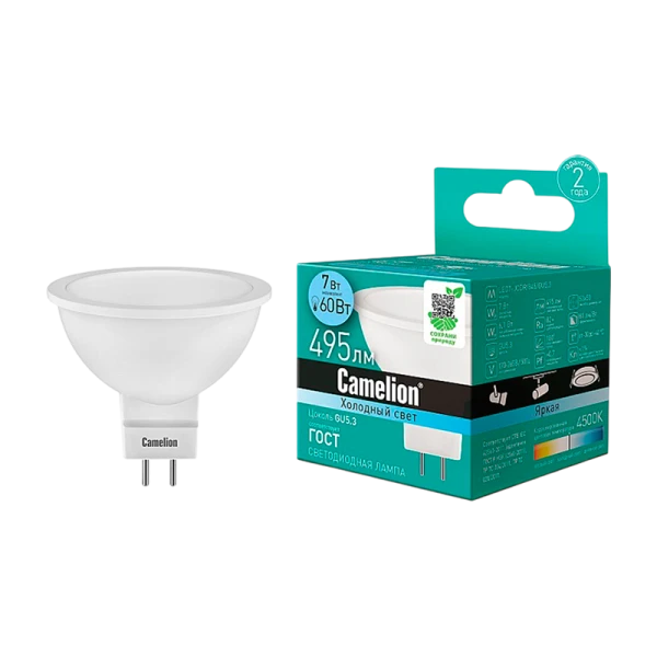 Светодиодная лампа Camelion LED7-JCDR/845/GU5.3 мощностью 7Вт, напряжением 220В. Подходит для освещения жилых, офисных и коммерческих помещений. CДЛ Camelion - это инновационное решение, разработанное на основе новейших светодиодных технологий (LED). Предназначена для освещения жилых, офисных и коммерческих помещений. Встроенный источник питания позволяет использовать СДЛ Camelion в стандартных патронах.
