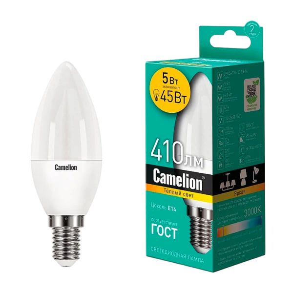 Светодиодная лампа Camelion LED5-C35/830/E14 - это инновационное решение с мощностью 5Вт, созданное для освещения офисных и коммерческих помещений. Обеспечивает световой поток в 410 лм и имеет матовый колбу в форме свечи.
