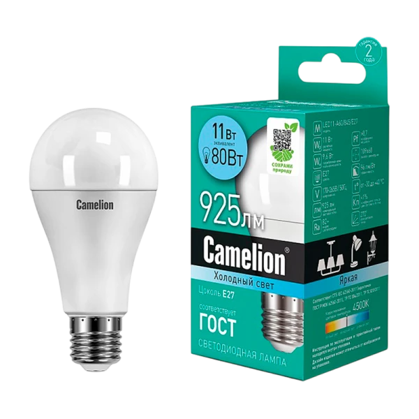 Светодиодная лампа Camelion LED11-A60/845/E27 мощностью 11Вт и цветовой температурой 4500K. Идеально подходит для жилых, офисных и коммерческих помещений.
