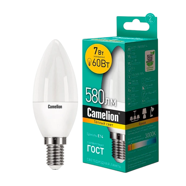 Светодиодная лампа Camelion LED7-C35/830/E14, мощность 7Вт, 3000К, идеально подходит для освещения офисов и коммерческих помещений. Матовая лампа формы свеча с цоколем E14 гарантирует качественный свет и долгий срок службы.