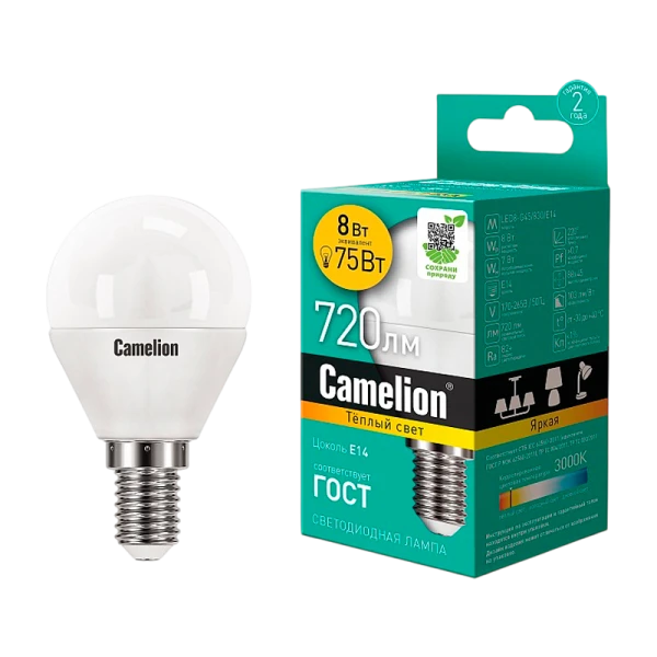 Camelion LED8-G45/830/E14 - светодиодная лампа мощностью 8Вт для освещения жилых, офисных и коммерческих помещений.