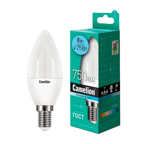 Светодиодная лампа Camelion LED8-C35/845/E14 мощностью 8Вт и цветовой температурой 4500K идеально подходит для использования в жилых и офисных помещениях.