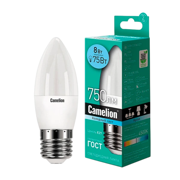 Светодиодная лампа Camelion LED8-C35/845/E27 мощностью 8Вт идеально подходит для освещения в жилых и офисных помещениях. Срок службы 30000 часов.