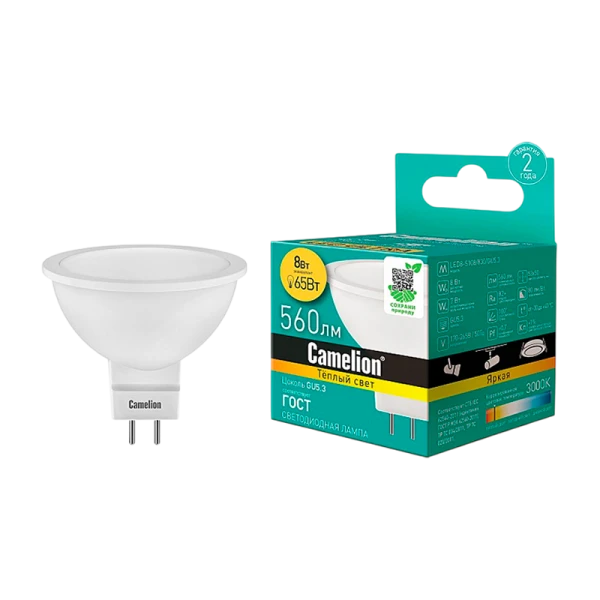 Camelion LED8-S108/830/GU5.3 - светодиодная лампа мощностью 8Вт для освещения жилых, офисных и коммерческих помещений. Номинальное напряжение 220В, цветовая температура 3000K, световой поток 560лм. CДЛ Camelion - это инновационное решение, разработанное на основе новейших светодиодных технологий (LED). Предназначена для освещения жилых, офисных и коммерческих помещений. Встроенный источник питания позволяет использовать СДЛ Camelion в стандартных патронах.