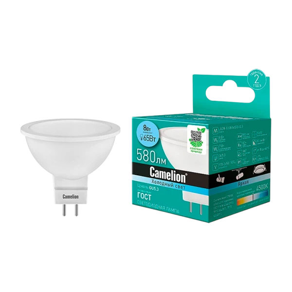 Светодиодная лампа Camelion LED8-S108/845/GU5.3 отлично подходит для освещения жилых, офисных и коммерческих помещений. Обеспечивает мощность 8 Вт и световой поток 580 лм.