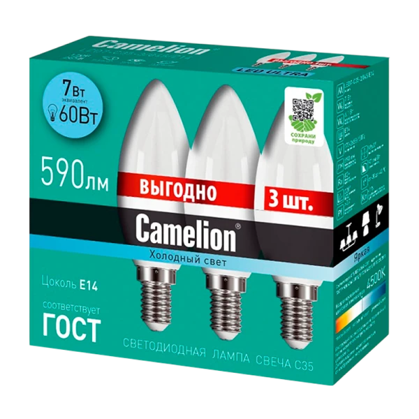 Светодиодная лампа Camelion LED7-C35-3/845/E14 мощностью 7Вт и цветовой температурой 4500K. Прекрасно подходит для жилых, офисных и коммерческих помещений.