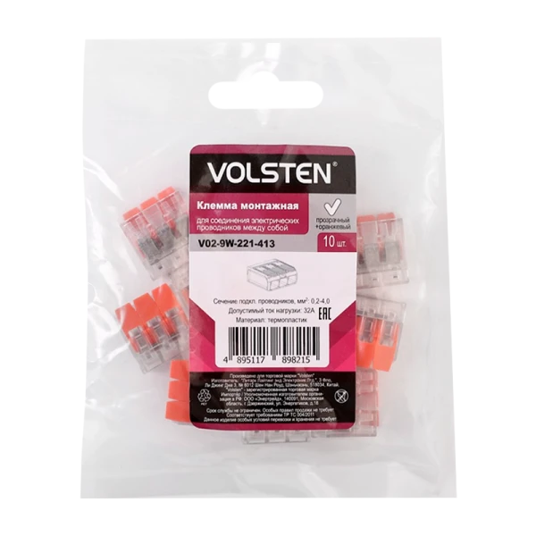 Строительно-монтажная клемма Volsten V02-9W-221-41 3 пр. до 4 мм, 32А, 450 В, 10 шт., оранжевый