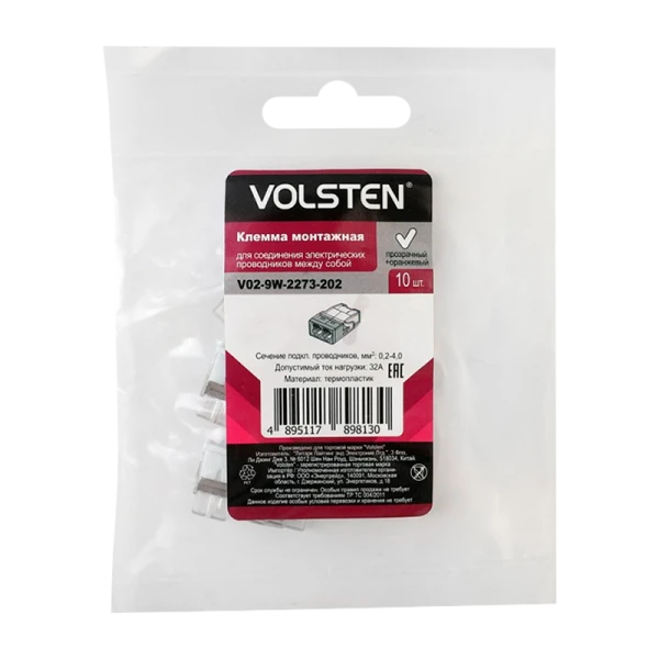 Строительно-монтажная клемма с пастой Volsten V02-9W-2273-202 Cu/Pb 2 пр. до 2,5 мм, 10 шт