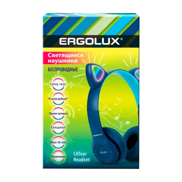 Беспроводные накладные наушники синего цвета Ergolux ELX-BTHP02-C06 с ушками оснащены Bluetooth V5.3, встроенным микрофоном, MP3-плеером и FM-радио. Светящиеся кошачьи ушки, складная конструкция, время работы до 8 часов. Идеально подходят для IOS и Android, совместимы с различными устройствами.