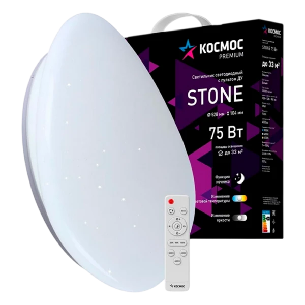 Светильник светодиодный Космос STONE Premium 75Вт – это идеальное решение для создания комфортного и современного освещения в вашем доме или офисе. С мощностью 75 Вт и световым потоком 6000 лм, светильник Космос STONE Premium обеспечивает яркость, необходимую для комфортного восприятия. Он прекрасно подходит как для настенного, так и для потолочного монтажа, что делает его универсальным выбором для любого интерьера. Световая температура данного светильника варьируется от 3000K до 6500K, что позволяет вам настроить освещение в зависимости от настроения и времени суток. Вы можете выбрать теплый, уютный свет для вечерних посиделок или яркий, холодный свет для продуктивной работы. Управление светильником осуществляется с помощью удобного пульта дистанционного управления, что добавляет комфорта в использование.