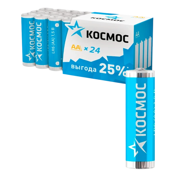 Щелочные (алкалиновые) батарейки Космос – в упаковке 24 шт (в удобном пластиковом контейнере для хранения). Типоразмер батареек АА также называют «пальчиковые» (на приборах-потребителях может обозначаться как LR6, R6, UM3). Работают как дорогие батарейки – по результатам независимых тестов показали результат сопоставимый с ТОП-3 известных батареек. Продолжительный срок годности - могут храниться до 7 лет, не потеряв при этом значительной емкости энергии.