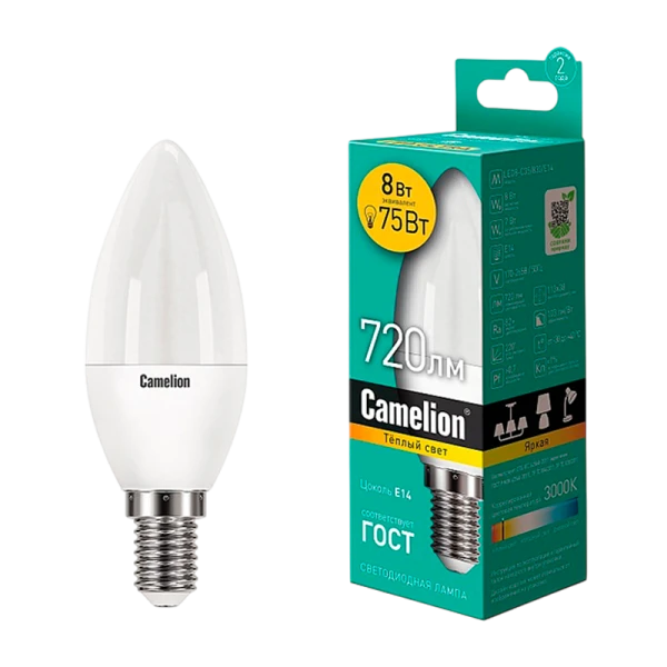 Светодиодная лампа Camelion LED8-C35/830/E14 мощностью 8Вт идеально подходит для освещения офисных и коммерческих помещений. СДЛ Camelion - это инновационное решение, разработанное на основе жилых, новейших светодиодных технологий (LED). Предназначена для освещения офисных и коммерческих помещений. Встроенный источник питания позволяет использовать СДЛ Camelion в стандартных патронах.