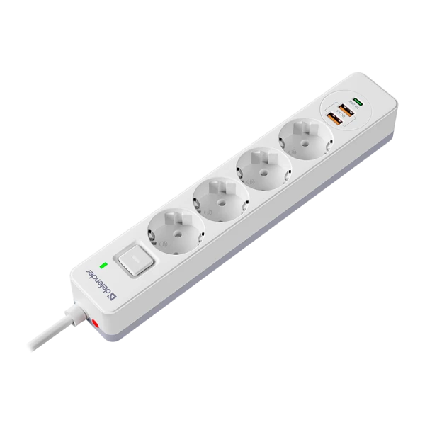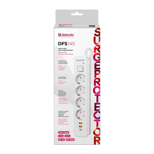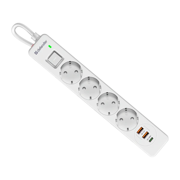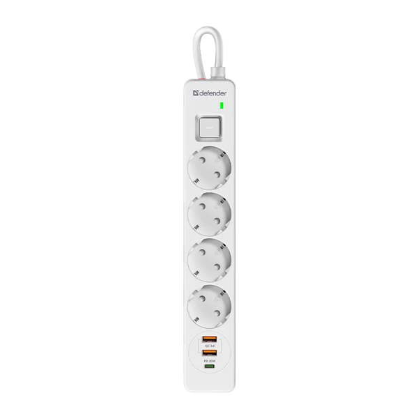 Сетевой фильтр Defender DFS 145 4р.С/З 16A 5.0м 2USB+Type-C 380 Дж белый (1/20)