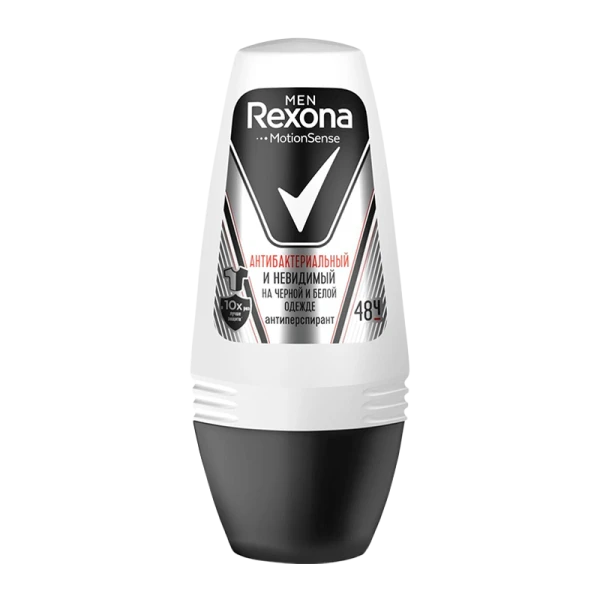 Шариковый дезодорант-антиперспирант Rexona Men Антибактериальный и невидимый на черной и белой одежде с технологией двойной защиты: нет поту, нет запаху, нет белым следам на черном и желтым пятнам на белом. В его формуле достигнут оптимальный баланс: концентрация активного компонента делает формулу невидимой на коже и одежде и обеспечивает в 10 раз более эффективную защиту против бактерий, вызывающих неприятный запах, а также бережно относится к нежной коже подмышек.