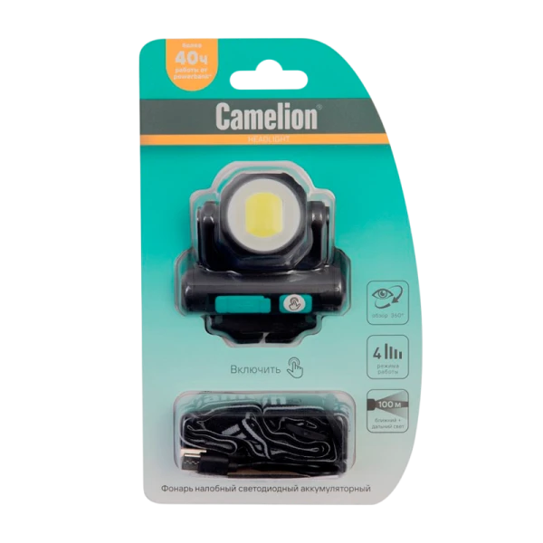 Фонарь налобный Camelion LED53402 3.5W LED+COB от аккумулятора Type-C 4 режима черный (1/12/96)