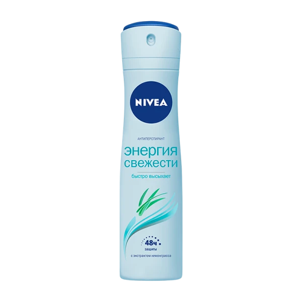 Дезодорант-антиперспирант спрей для женщин NIVEA «Энергия свежести» подарит Вам ощущение бодрящей свежести, которое Вы будете чувствовать весь день. Благодаря специальной формуле с экстрактом лемонграсса, антиперспирант эффективно контролирует уровень потоотделения в течение 48 часов. Антиперспирант быстро высыхает, не оставляя ощущения липкости на коже. Не оставляет следов на одежде. Без этилового спирта в составе.