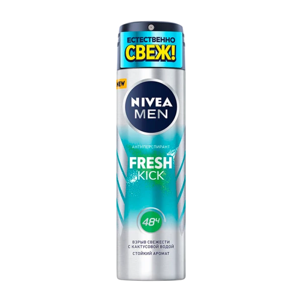 Дезодорант-антиперспирант спрей подарит вам чувство бодрящей свежести, приятный аромат и надежную защиту от пота и неприятного запаха на протяжении 48 часов. Необычным компонентом нового антиперспиранта является кактусовая вода, которая вместе с другими ингредиентами дает ощущение свежести от NIVEA Fresh Kick как после душа в жаркий день! Защитите себя от пота, забудьте о неприятном запахе, вместо этого почувствуйте чистоту после каждого применения. Будь естественно свеж вместе с NIVEA Fresh Kick!
