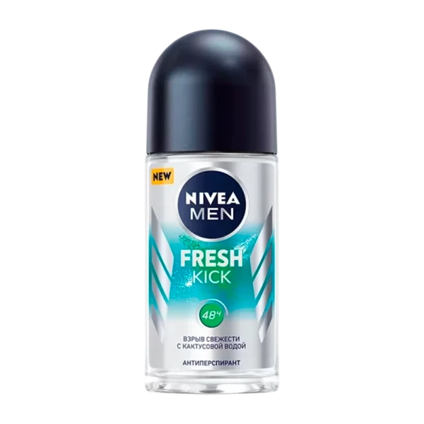 Главным компонентом свежести нового антиперспиранта является кактусовая вода, которая вместе с другими ингредиентами дает ощущение свежести как после душа в жаркий день и обеспечивает деликатный уход без раздражения кожи. Стойкий аромат свежести будет с тобой весь день. Шариковый дезодорант-антиперспирант даёт в 2 раза больше применений, чем спрей! Будь естественно свеж вместе с Nivea MEN Fresh Kick! Применение: наносить ежедневно на сухую чистую кожу подмышек.
