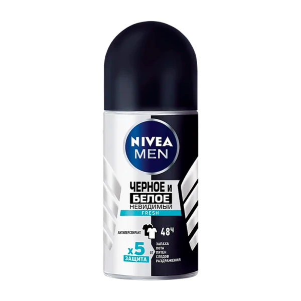 Роликовый дезодорант-антиперспирант NIVEA MEN Черное и Белое Невидимый Fresh предотвращает появление белых пятен на темной одежде и желтых пятен на светлой. Черная одежда остается черной, а белая одежда дольше остается белой. Уникальная формула Nivea имеет 5 факторов защиты от: запаха, пота, пятен, следов и раздражения. Защищает кожу подмышек от неприятного запаха в течение 48 часов и обладает антибактериальным эффектом, который препятствует размножению бактерий, вызывающих неприятный запах.