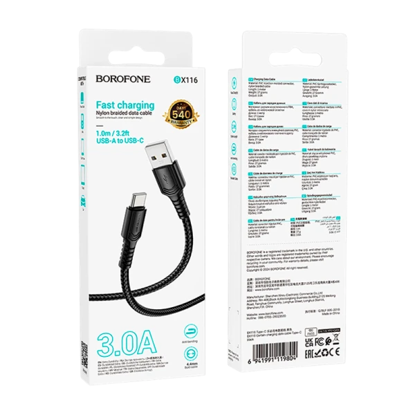 Кабель Borofone BX116 USB (m)-Type-C (m) 1м 3.0A черный.