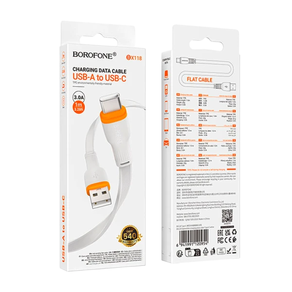 Кабель Borofone BX118 USB (m)-Type-C (m) 1м 3.0A ПВХ белый (1/360)