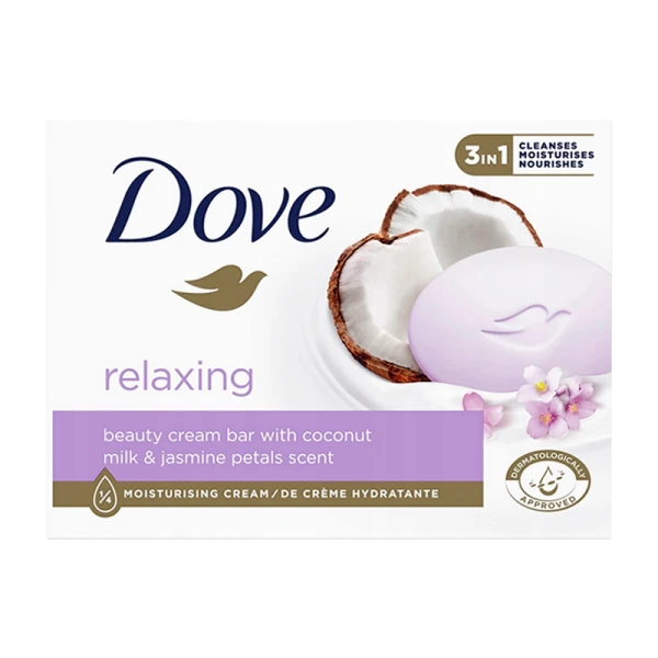 Крем-мыло Dove Relaxing 90г с кокосовым молоком и ароматом цветов жасмина. Обогащенное экстрактом кокосового молока и ароматом цветов жасмина, оно придает вашей коже ощущение нежности, увлажнения и приятного аромата. С уникальной формулой, содержащей 1/4 увлажняющего крема Dove, это мыло не только эффективно очищает кожу, но и увлажняет ее, делая мягкой и гладкой. Кокосовое молоко питает и увлажняет кожу, придавая ей здоровый вид и ощущение комфорта, а аромат цветов жасмина наполняет вашу кожу нежностью и спокойствием. Идеально подходит для ежедневного использования, обеспечивая вашей коже мягкий уход и невероятную нежность.