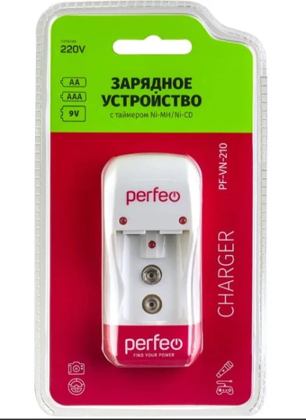 Perfeo PF-VN-210 – компактное зарядное устройство с таймером. Предназначено для быстрого, безопасного многократного заряда 1-го или 2-х аккумуляторов AA/AAA или одного аккумулятора типа "Крона" 9V(6F22) c никель-металлогидридной и никель-кадмиевой (Ni-MH/Cd) электрохимической системой.