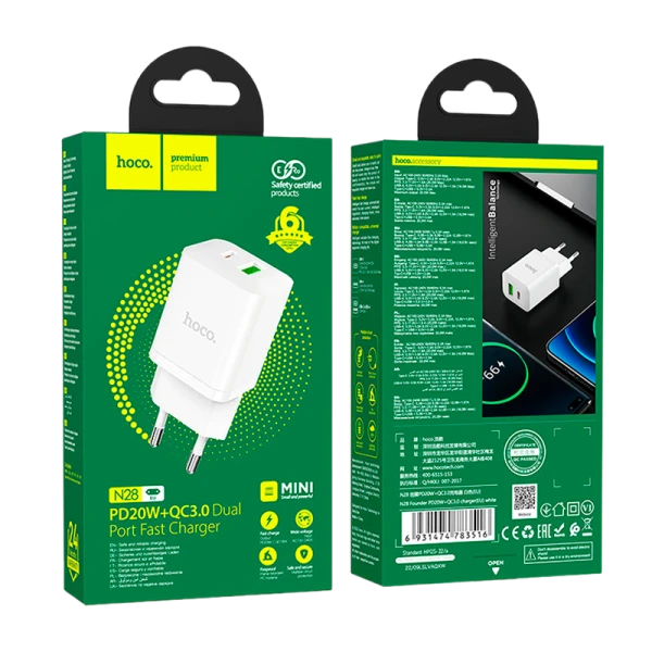 Сетевое З/У HOCO N28 1USB/Type-C 3.0A 20W PD,QC белый (1/13/130)