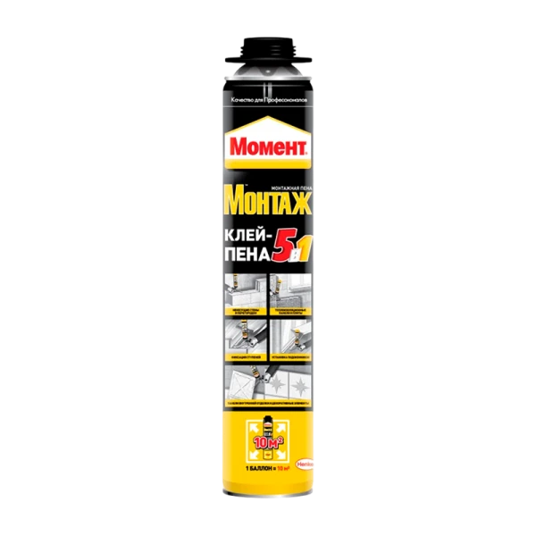 Монтажная клей-пена Момент МОНТАЖ 5в1 750мл - это профессиональная однокомпонентная полиуретановая клей-пена для различных применений.