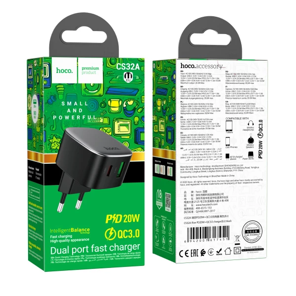 Сетевое З/У HOCO CS32A 1USB+1Type-C 20W QC3.0 черный (1/12/120)