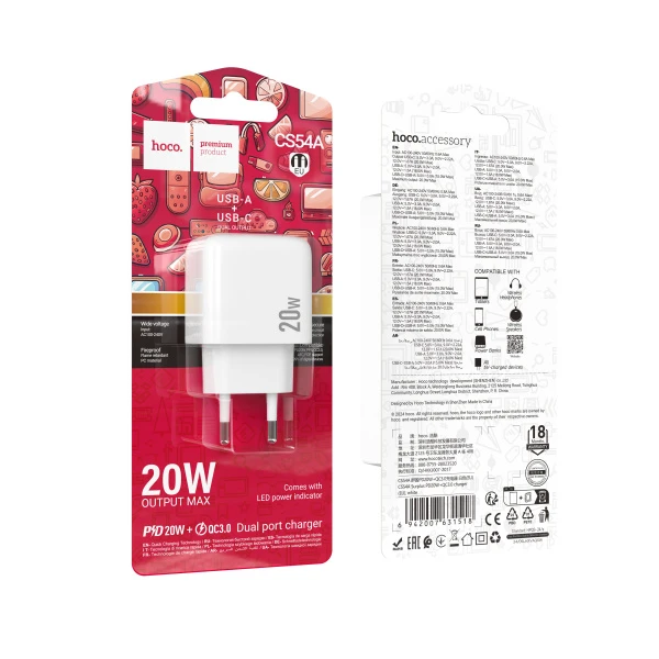 Сетевое З/У HOCO CS54A 1USB+1Type-C 3.0A 20W QC3.0 белый (1/30/180)