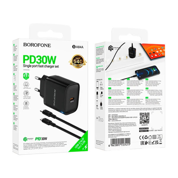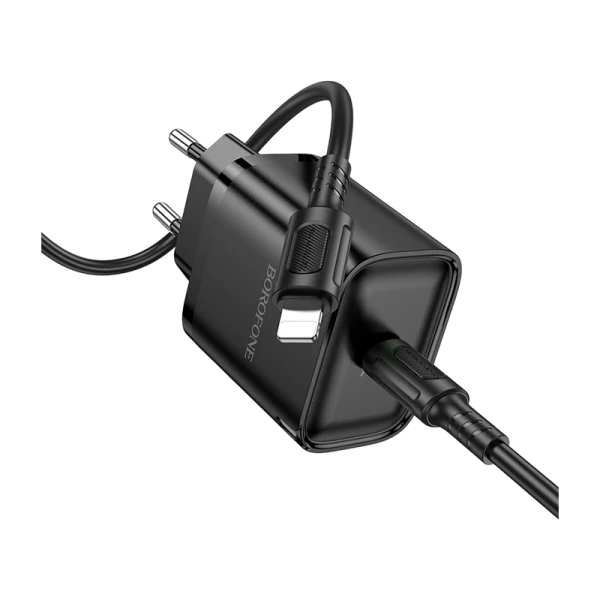 Сетевое З/У Borofone BA84A 1USB/Type-C 30W PD,QC с кабелем Lightning черный.