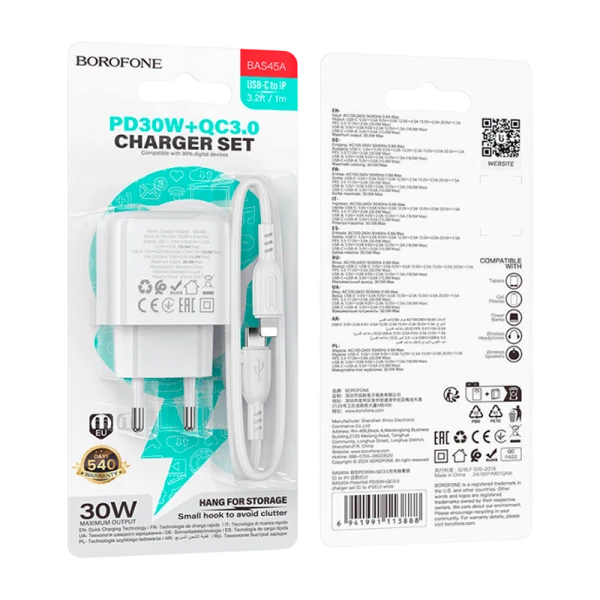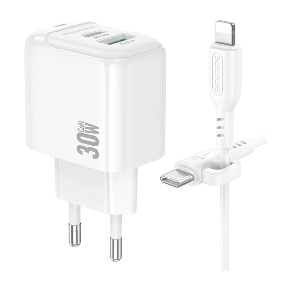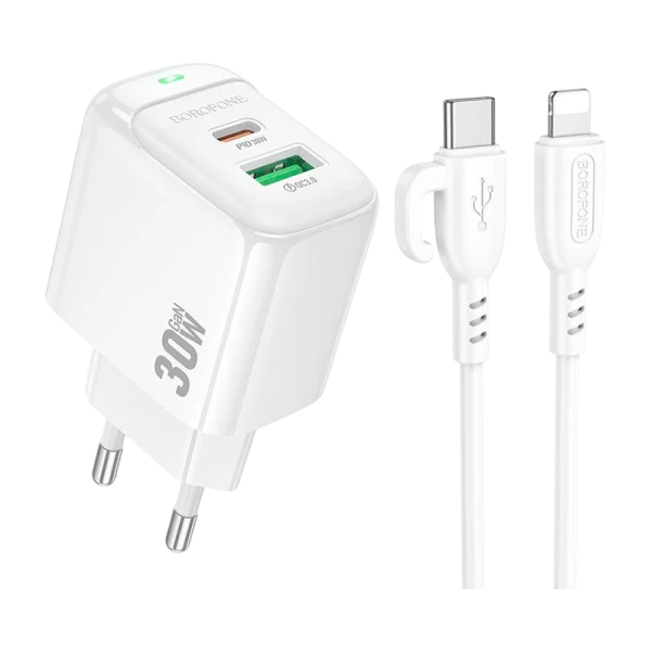 Сетевое З/У Borofone BAS45A Type-C 3.0A 30W QC3.0 / PD3 с кабелем Lightning белый