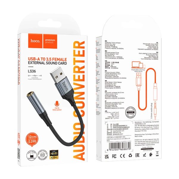 Кабель AUX HOCO LS36 USB (m)-Jack 3.5mm (f) 12см черный;